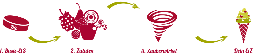 Bei uns wirst du zum EIS-Zauberer! Die Grundlage ist unser Bio-Basis-EIS. Jetzt kommen deine Zutaten. Deiner Kreativität sind dabei keine Grenzen gesetzt. Der Zauberwirbel verwandelt deine Kreation vor deinen eigenen Augen in ein unverschämt cremiges EiZ. Und jetzt? Lass es dir schmecken!